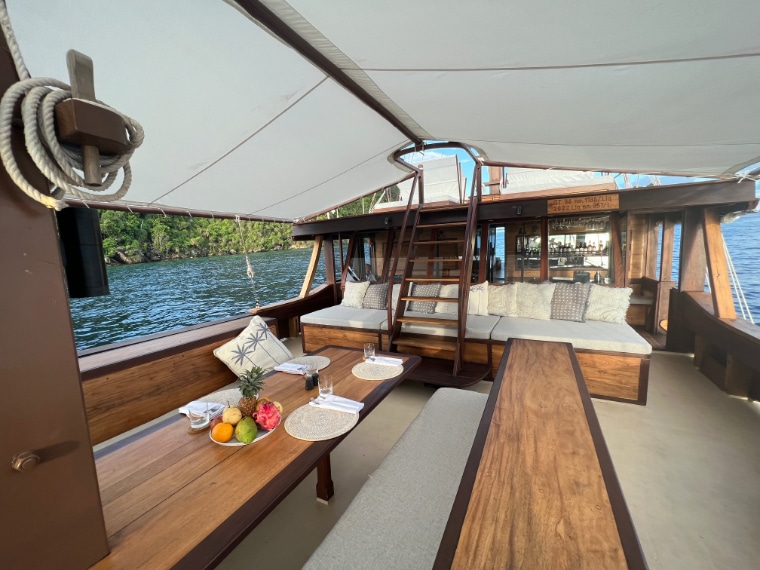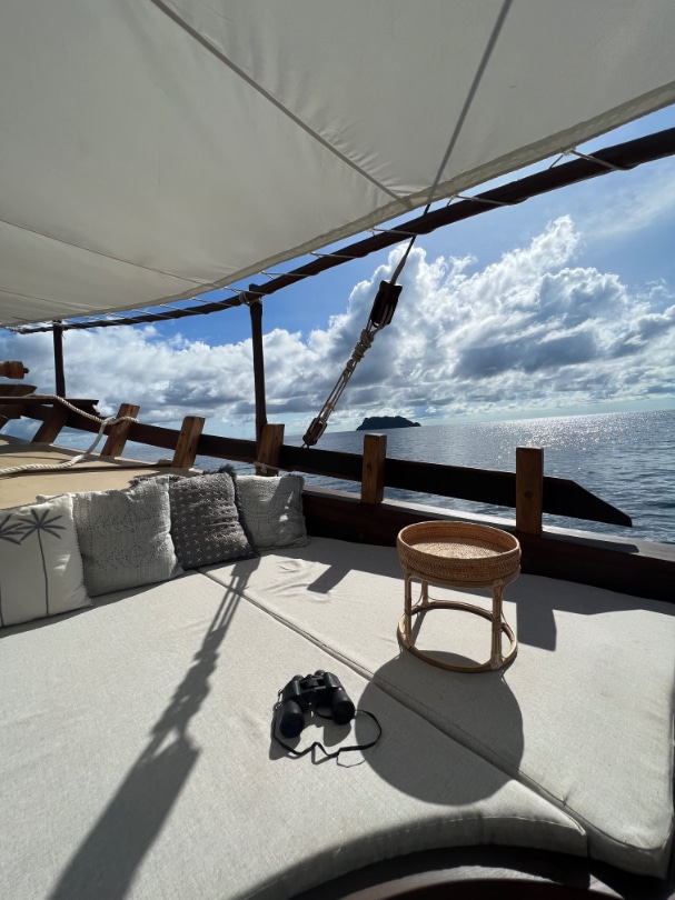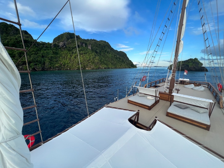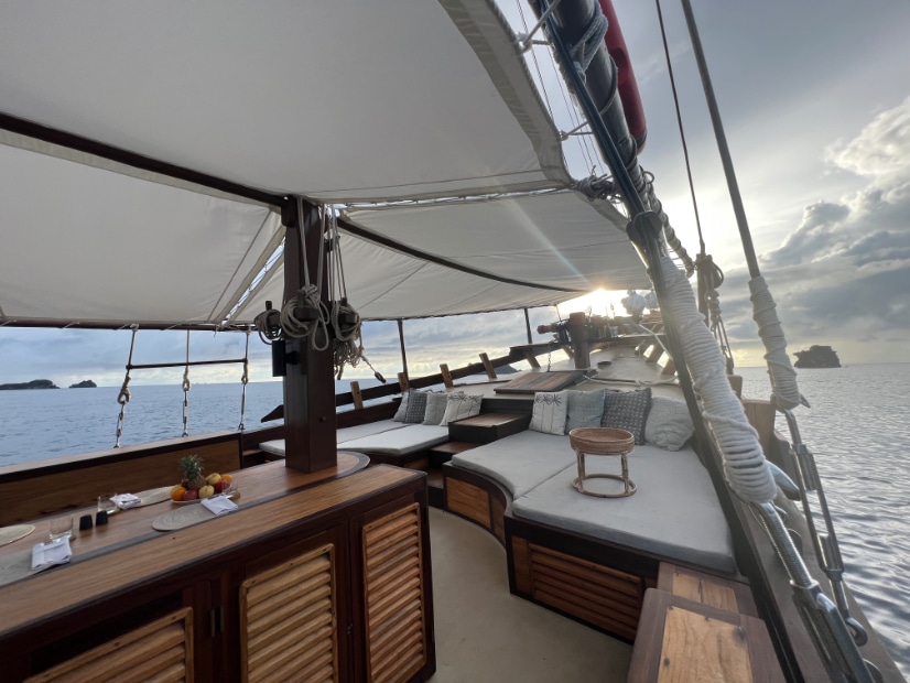 Back on board, the shaded deck invites an afternoon massage, followed by a light lunch. Maybe today it is grilled mahi-mahi with a zesty sambal, served as you recline under the shade of billowing sails. You are surrounded by silence, except for the soft lap of water and distant birdsong from the cliffs.